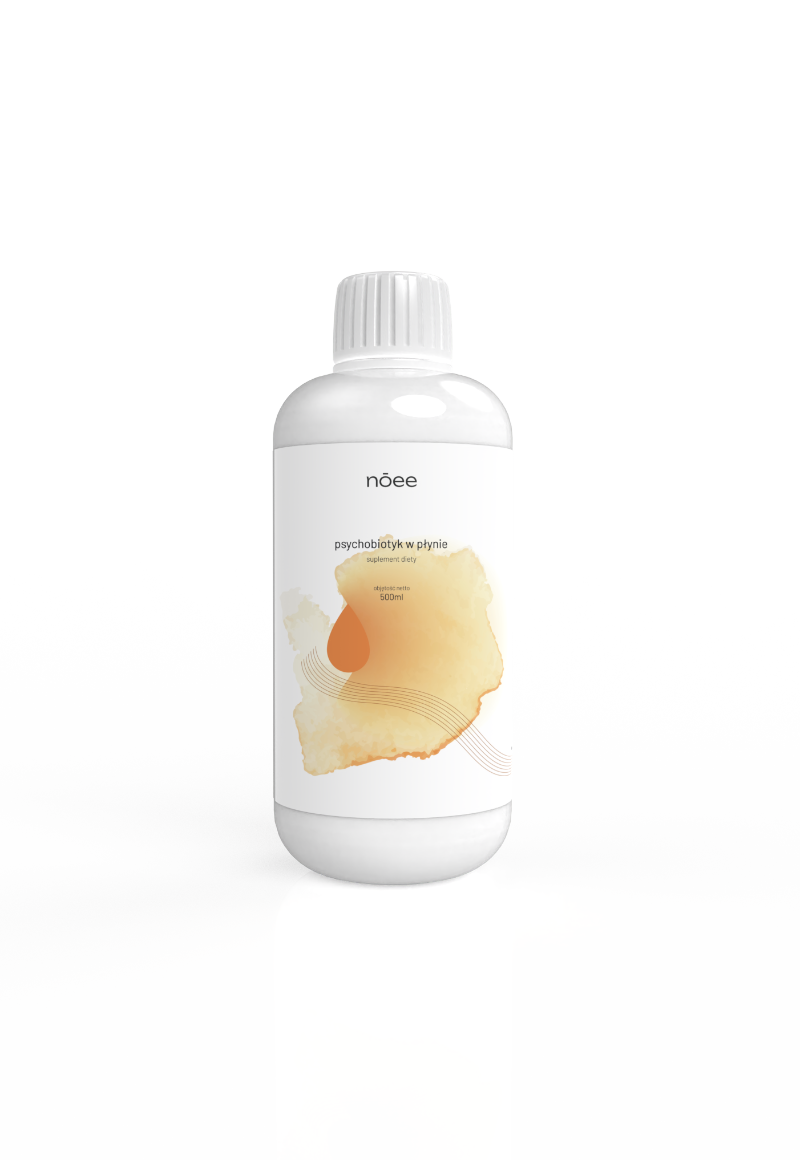 nōee. Jedyny na rynku psychobiotyk w płynie, który dzięki swojej formule, wykazuje znacznie lepszą przyswajalność niż probiotyki w tabletkach.